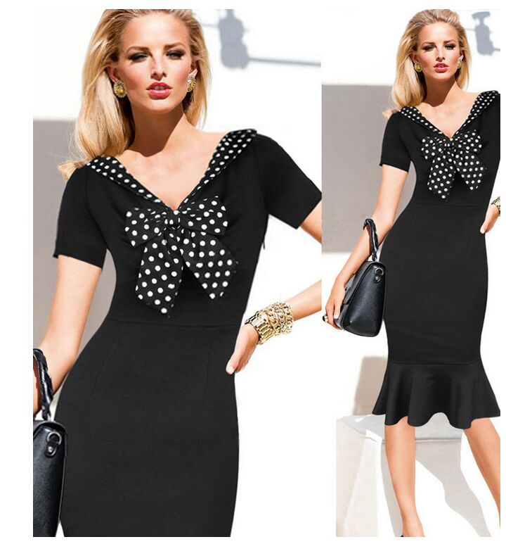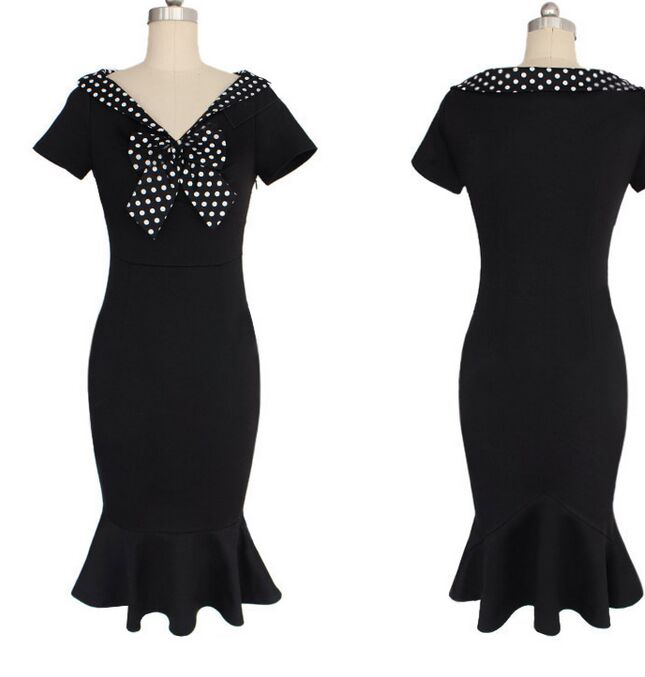 | Vintage V-Neck Short Sleeve Polka Dot Bowknot Fishtail Mermaid Dress L36055 |