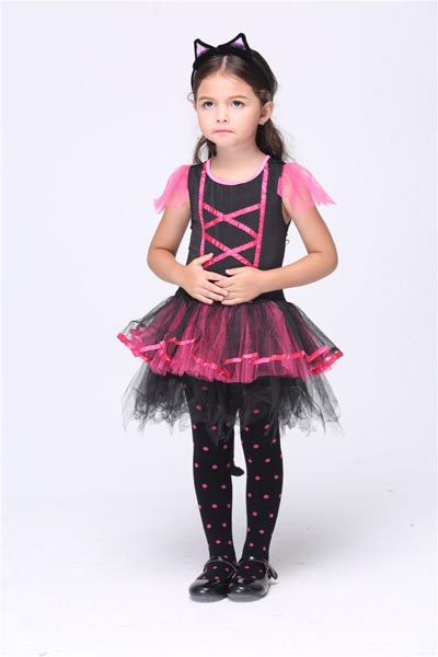 Caterina Toddler Costume L15295The Caterina toddler costume consists of a black and pink dress with faux lace-up bodice and fabulous tutu skirt, a matching cat ear headband and black tail .