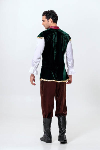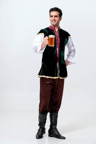 Adult Tavern Man Renaissance Medieval Costume L15306 Product Description Tavern Man Adult Costume includes Velour Shirt With Poly Sleeves And Gold Trim Lace up Detail And Matching Pants. Please note color of shirt is forest green and pants are brown.