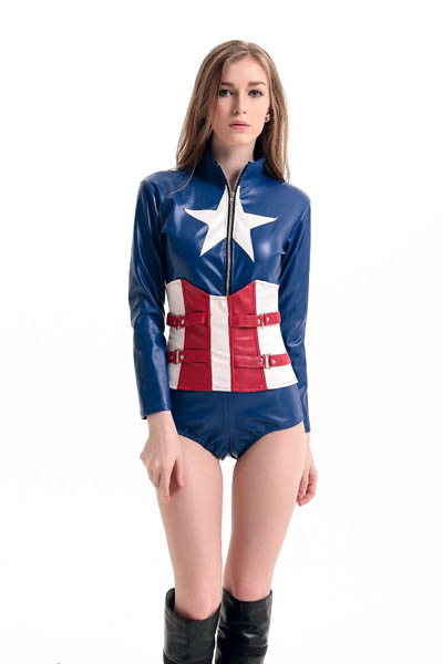 All American Temptress Costume L15302 Flaunt your patriotism in this All American Temptress costume featuring a blue metallic romper with long sleeves, front zipper closure, silver star detailing, and a silver and red waist cincher with lace-up back.