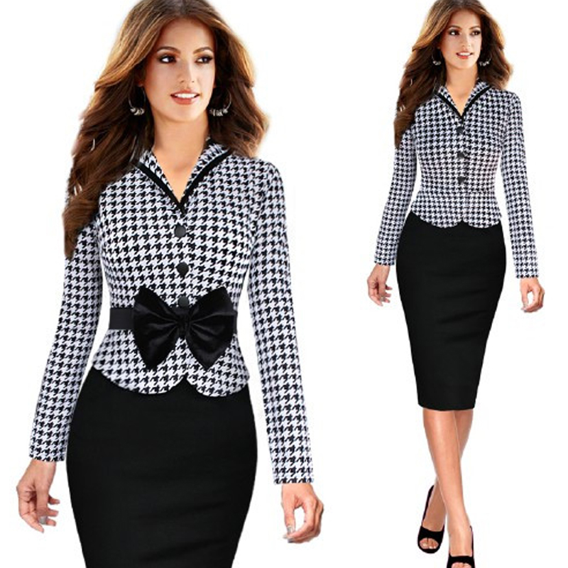 | Formal Single Breasted Long Sleeve Robe Hiver Bow Plaid Office Dress L36070-2 |