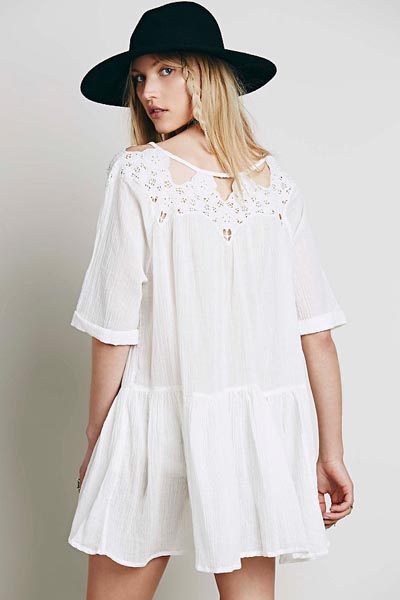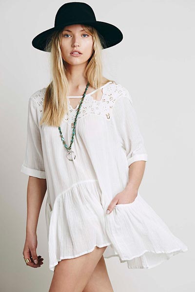 Effortless, oversized drop waist tunic in a sheer lightweight cotton. Features beautiful cutwork detailing along the neckline. Slip pockets in front and a high low hem.