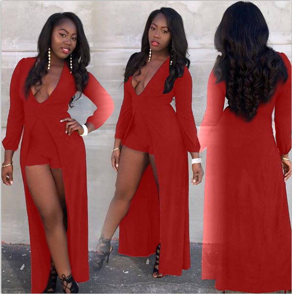 Red Sleeve V-Neck Maxi Romper L55178-2
