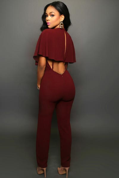 Santana Wine Red Cape Jumpsuit L55176-1 Definably chic, this jumpsuit is a must for every style-setter. The cape overlay delivers runway-worthy appeal while the body-con fit adds a flattering, curve-defining finish. V neckline Cape design Key-hole Back zipper Slim legs