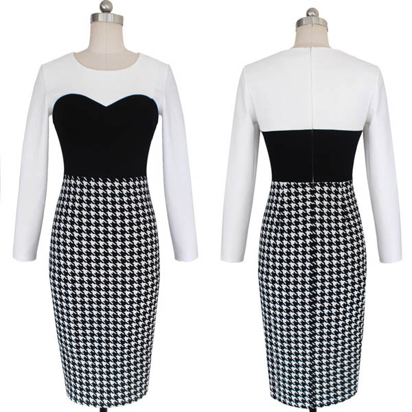 | Elegant Women Houndstooth Pencil Bodycon Long Sleeve Work Tunic Dress L36080 |