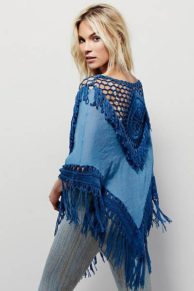 Gauzy poncho featuring intricate crochet detailing along the bodice and crochet fringe hem. Easy, effortless fit.