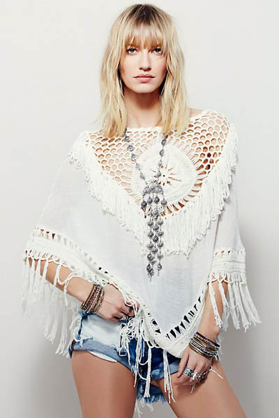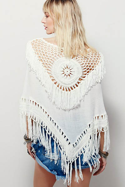 Gauzy poncho featuring intricate crochet detailing along the bodice and crochet fringe hem. Easy, effortless fit.