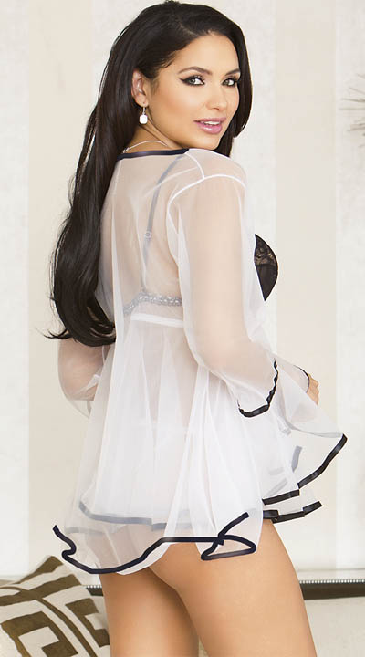 Sheer White Babydoll And Robe Set L28021 This romantic set features a cute babydoll with black underwire lace cups, a satin bow accent, adjustable spaghetti straps, a sheer white skirt, a black satin trim, a matching panty, and a matching sheer white robe with a black trim and long draping sleeves.