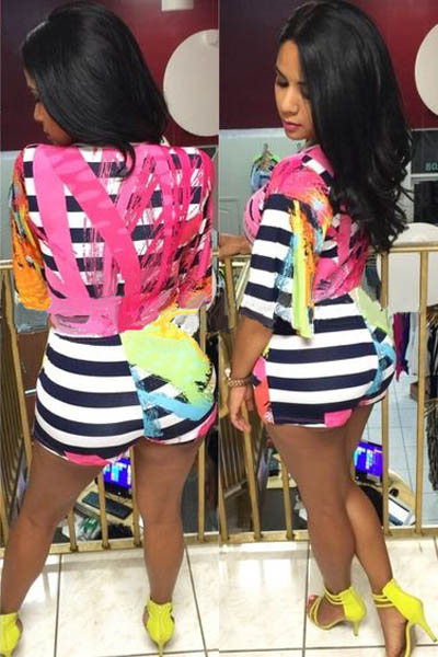 | Sexy Deep V Neck Women Stripe Printed Half Sleeves Jumpsuits L55197 |