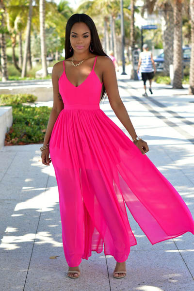 Sassy Hot Pink Open Back Maxi Dress L51291-1 PRODUCT DESCRIPTION Be the best dressed at any event in this striking maxi dress. V neckline Open back Adjustable spaghetti straps Paneled skirt