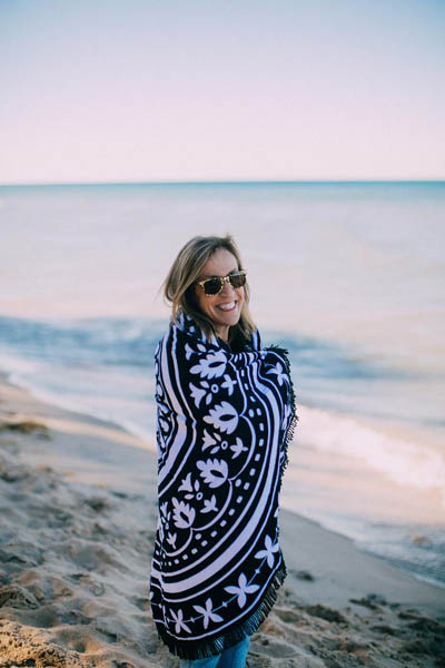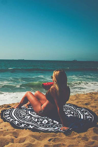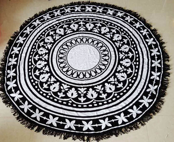 Queen Of The Beach Round Towel L38356 Bohemian round beach towel with black fringe for the Queen of the Beach. This summer fun round beach towel fits two people. Invite your dog, your best friend, or you partner. Functions as beach towel and stylish accessory, simply adjust yourself to adjust your tan lines. Round is better than square.