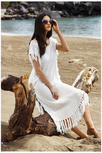 White Cotton Resort Style Beach Dress Fringed Swimsuit Cover Up L51322