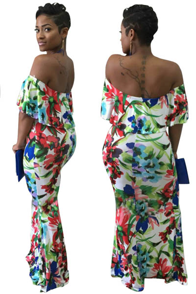 | Flowers Printed Sexy Dew Shoulder Maxi Dress L51329 |