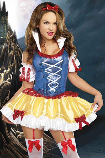 | The adventurous Disney character costume includes a cerulean blue knee-length dress with cap sleeves, |
