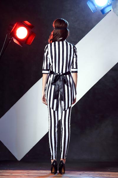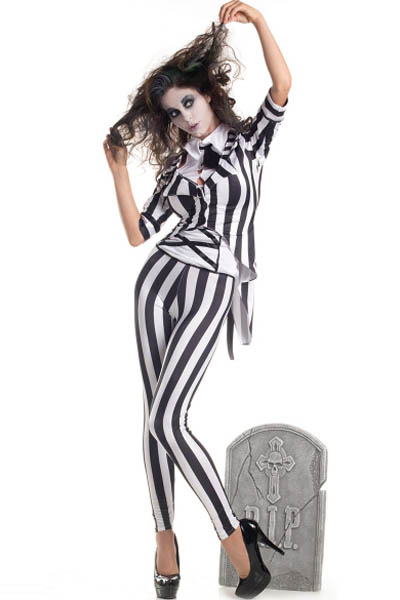 | The Graveyard Ghost costume includes a black and white striped jacket with |