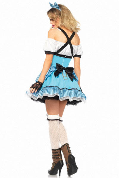 This 3PC Alice in Wonderland costume includes a striped dress with lace trimmed pannier skirt and faux leather buckle strap accents,