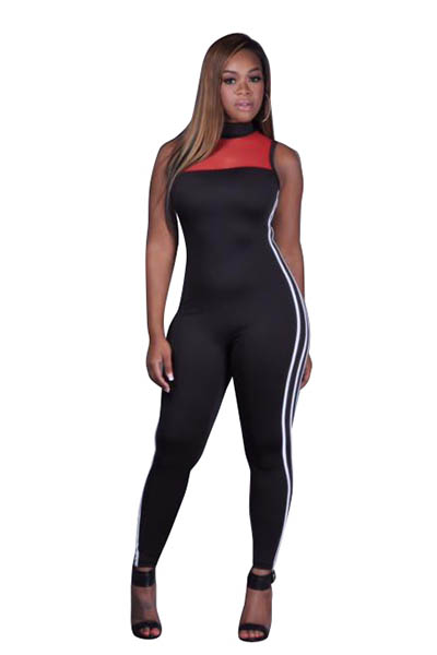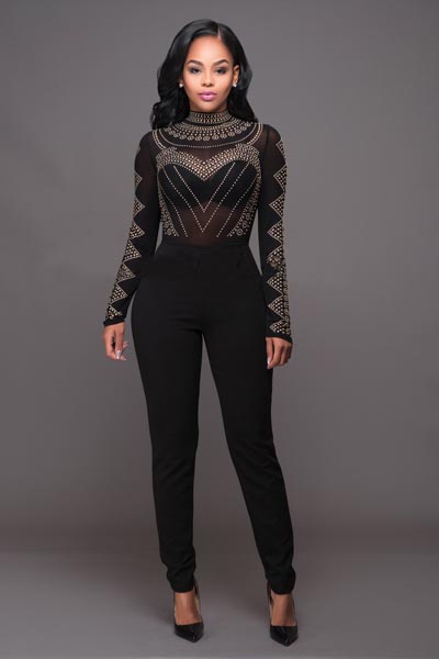Sensual Scrolls Jumpsuit L55236 Take a stroll in these sensual scrolls! This sexy jumpsuit features a high neck, wet look front paneling with a plunging faux V-neck, sheer scroll patterned, fishnet panels, wet look back paneling, long leggings, and a gold zipper back closure.
