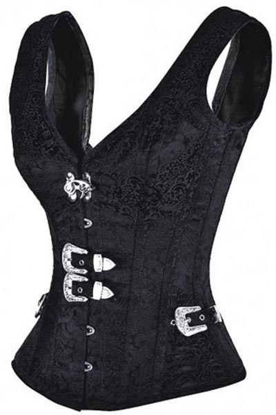 Black 12 Steel Bone Brocade Vested Corset L42681 The hauntingly beautiful design of this vested brocade corset will make on-lookers envious of your fashion sense. The 12 Steel Bone Brocade Vested Corset goes well with almost any other color in your wardrobe. This overbust features wide shoulder straps that curve slightly inward, creating an attractive neckline that vees toward the center. A metal busk runs down the front of the corset, along with a clasp at the top and ornate buckles in the middle. Clasps appear on each side as decoration. The back of the corset laces for a good fit. The authentic steel boning accentuates your waistline, while the cotton lining increases comfort. Features 1.Laces up the back through two rows of grommets 2.Made from quality polyester and spandex blend fabric 3.Fastens in the front with a metal busk, clasp, and buckles