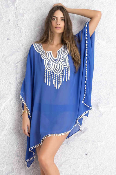 Royal Blue Crochet Lace Neck Pompom Trim Sheer Chiffon Caftan L38290