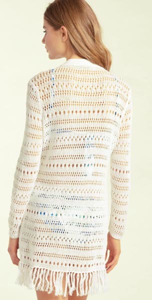 Tommy Bahama Tassel Cardigan Sweater L38425 The Tommy Bahama Tassel Cardigan Sweater is a classic long cardigan style coverup or sweater perfect for the beach. Long sleeve Cadirgan style sweater/coverup Tassel detail along hem Falls to mid thigh