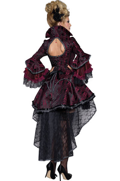Deluxe Vamp costume L15489 Drain your victims in this Deluxe Victorian Vamp costume featuring a two-tone brocade and satin shimmer dress with pleated satin trim accents, bell sleeves with eyelet and ribbon lace-up closure, keyhole cut out back, satin shimmer skirt with attached tulle petticoat, and lace choker with skull cameo and red jewel. (Thigh high stockings, headpiece and jewelry not included.)