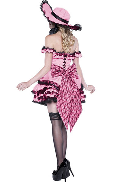 Deluxe Southern Belle Costume L15490 Be sweet as pie in this Deluxe Southern Belle costume featuring a deluxe pink dress with embroidered bodice, built-in boning, off the shoulder sleeves with ruffle trim, layered ruffled skirt, satin bow accents, attached petticoat, back bustle bow, lace-up back and matching wide brim hat with lace underlay, ruffled lace trim and black satin bow. (Stockings and jewelry not included.)