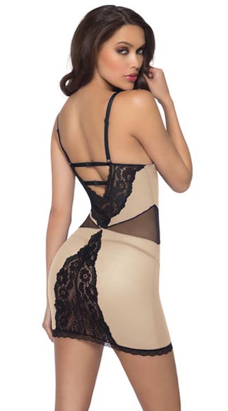 Pascaline Nude And Black Chemise Set L28173 Surprise your sweetie in this romantic chemise set featuring sheer lace underwire cups, adjustable spaghetti straps, a low-cut neckline, double strapped adjustable back bands, a sheer nude bodice with a black lace overlay, sheer black mesh panels, and a matching panty.