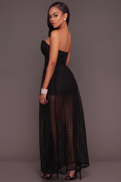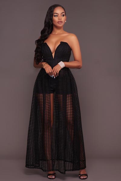 Benita Black Textured Mesh Romper Maxi Dress L55273-1 PRODUCT DESCRIPTION This floaty feminine creation is always perfect . Wear it to your next gathering for sexy appeal.