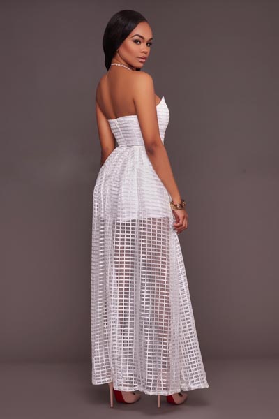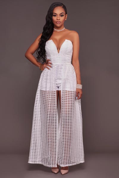 Benita Off-White Textured Mesh Romper Maxi Dress L55273-2 PRODUCT DESCRIPTION This floaty feminine creation is always perfect . Wear it to your next gathering for sexy appeal.