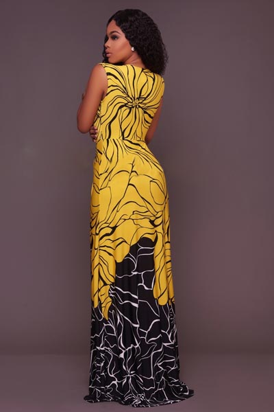 | Lynx Yellow Black Print Plunging V-Neck Maxi Dress L51371 |