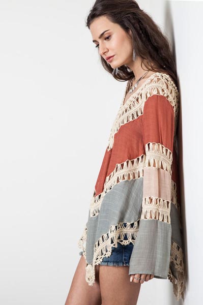 Multicolor Boho V-Neck Long Sleeve Crochet Tunic Top-Rust L38434