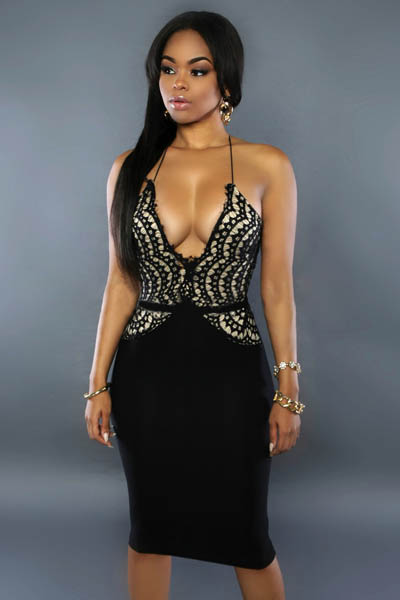 | Show some skin in this sexy wet look dress featuring a high neck, deep cut sleeves, |