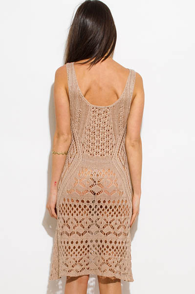 Taupe Mocha Beige Sleeveless See Through Crochet Boho Beach Cover Up L38455