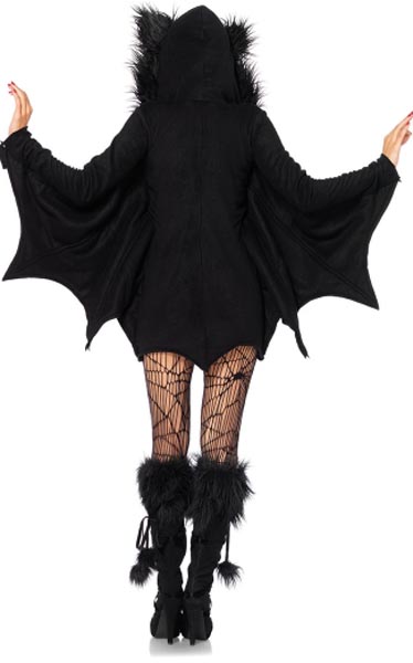 Soar through the night in comfort in this Fleece Bat costume featuring a black fleece dress with zip up front, attached bat wing sleeves, jagged hemline and attached hood with faux fur trim and ears.