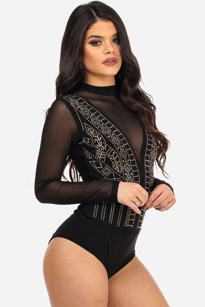 | Sexy Black Studded Mesh Long Sleeve Bodysuit L55290 |