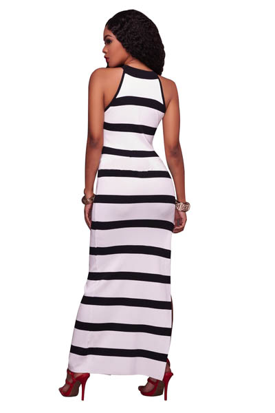 | Leena Black & White Stripe Fitted long Dress with Side Split L51390 |