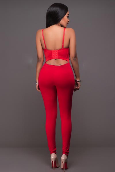 | Aiken Red Rhinestones Embellished Padded Jumpsuit L55294-3 |