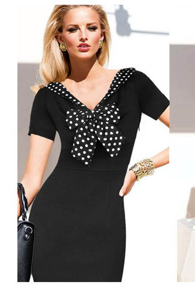 Vintage V-Neck Short Sleeve Polka Dot Bowknot Fishtail Mermaid Dress L36055