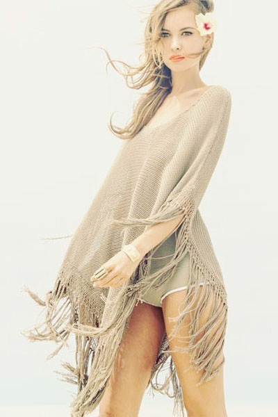 Khaki Knit Fringed Poncho Beachwear L38235-1