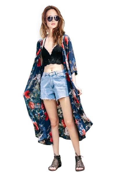 Navy Blooming Roses Sheer Chiffon Kimono L38265-2