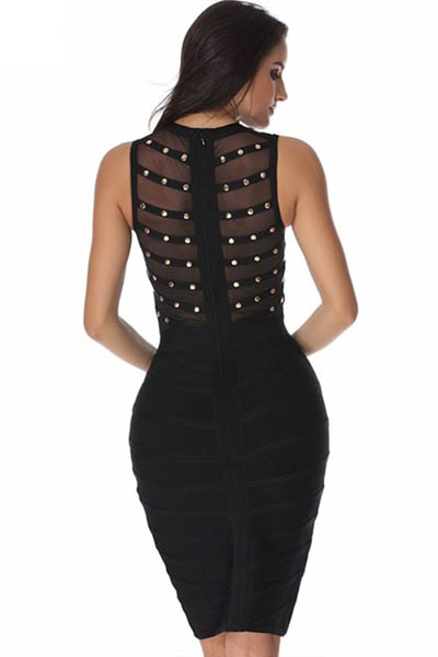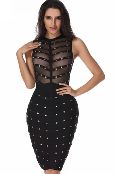 | Crafted from luxe bandage knit and designed with gold studs and a curve-skimming |