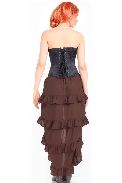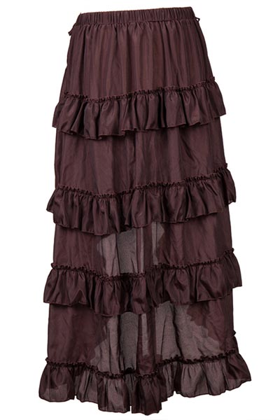 Steampunk Show Girl Skirt Brown L549-2 Steampunk Show Girl Skirt is made using soft & durable Rayon Fabric. The skirt has Four Tiers of Ruffles with adjustable length in front. The skirt can be worn down for Victorian styling, up on one side for Gypsy styling or front tied up for vintage burlesque looks. Waist has been elasticized for comfortable wearing.
