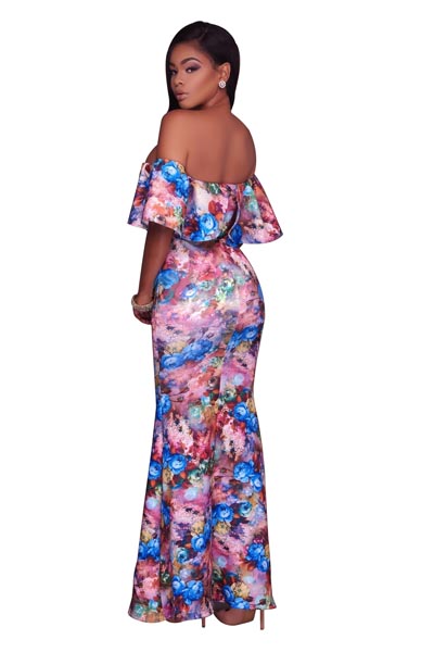 | Veronique Blue Multi-Color Floral Print Off-The-Shoulder Maxi Dress L51404 |