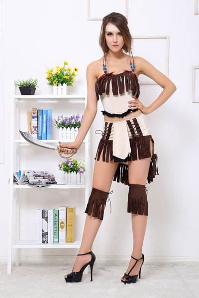The four-piece, Cherokee Princess costume includes a brown fringe bustier top with lace-up back, matching mini skirt with double lace-up front, headband with attached bead and feather accent and brown fringe boot toppers.